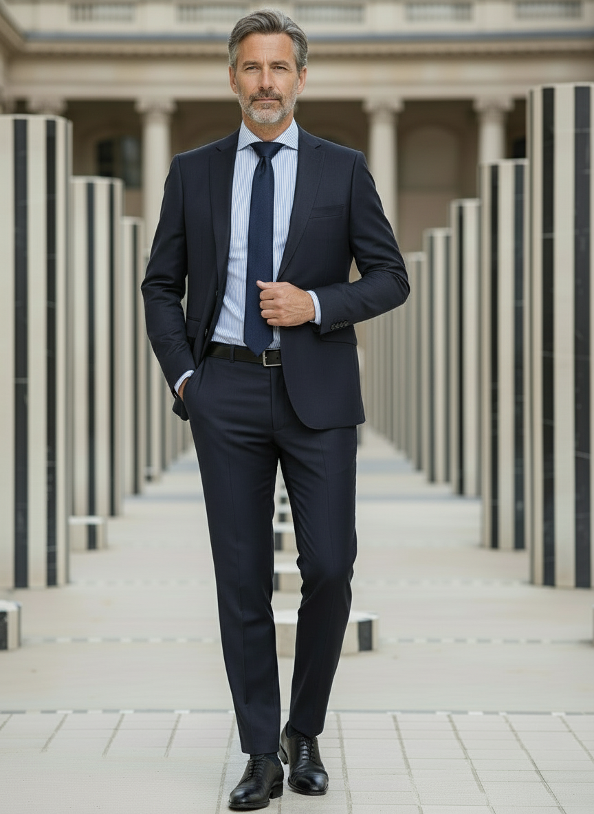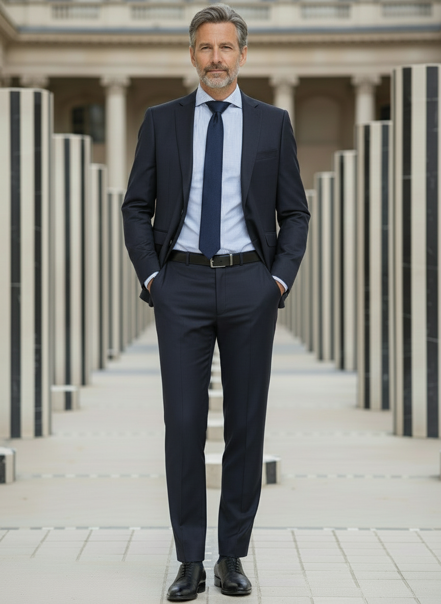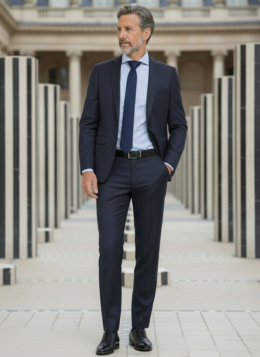 Ce costume marine est confectionné dans une laine italienne issue de la prestigieuse maison Lanificio F.lli Cerruti dal 1881, reconnue pour la finesse et la qualité de ses étoffes.